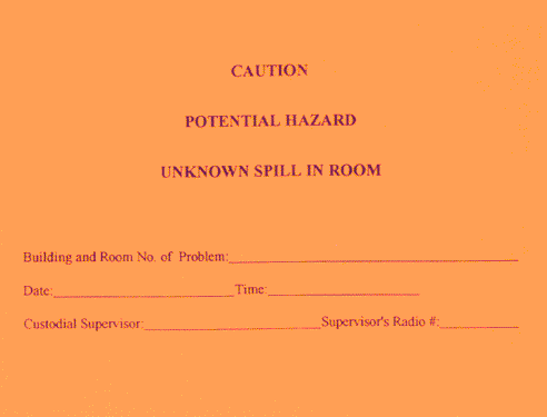 If satisfactory information provided by the laboratory emergency contact is received by the custodial supervisor, demonstrating that the spilled/released material is not dangerous or damaging, the custodial supervisor locks the laboratory door and leaves a message concerning the released material. Laboratory employees can manage the non-dangerous spilled material the following work day. Custodial employees are never required to clean up any spilled or released laboratory hazardous chemical material.